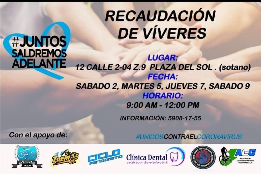 El Asociacion de ciclomontañismo de Guatemala esta pidiendo el apoyo de los Guatemaltecos para la recaudación de víveres y otro tipo de donaciones. Se espera que otros clubes se suman a este acto de solidaridad y que se replique en toda Guatemala.